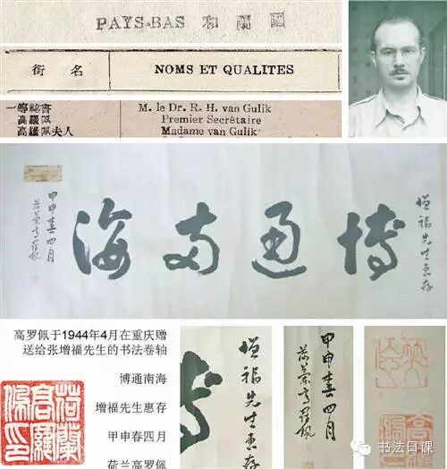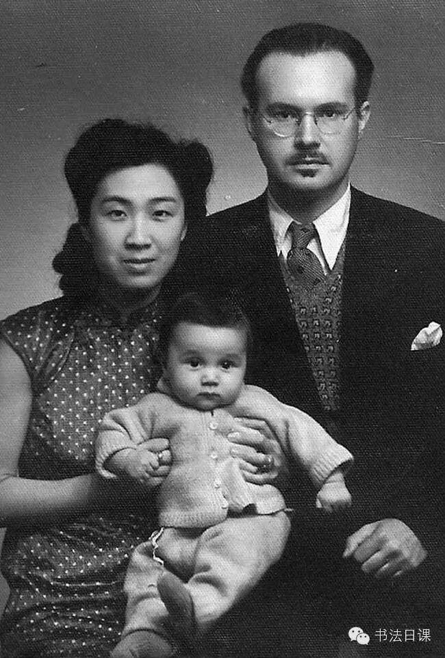 这是他的书法档案—— 这是他写字的姿态,和签名—— 高罗佩(1910~1967),号芝台,是罗伯特·汉斯·古利克的中文名。他是荷兰汉学家、东方学家、外交家、翻译家、小说家。作为荷兰职业外交官,他通晓15种语言,曾派驻泗水、巴达维亚、东京、重庆、华盛顿、新德里、贝鲁特、大马士革、吉隆坡等地,职务从秘书、参事、公使到大使。 高罗佩从20岁开始练书法,终生不辍,他偏爱行草书,笔力雄健,功底深厚。到重庆后,他把这种爱好发挥到了极致。他在这里成了家,娶晚清名臣张之洞的外孙女水世芳为妻,他的老丈人曾担任过天津市长。两人婚后,高罗佩给自己的书斋取名“吟月庵”。 这是高罗佩与妻儿—— 高罗佩只活了57岁,但他短暂一生成就卓著,又仿佛为中国而生。 他爱好古琴,曾拜古琴名家叶诗梦为师,并有古琴专著。